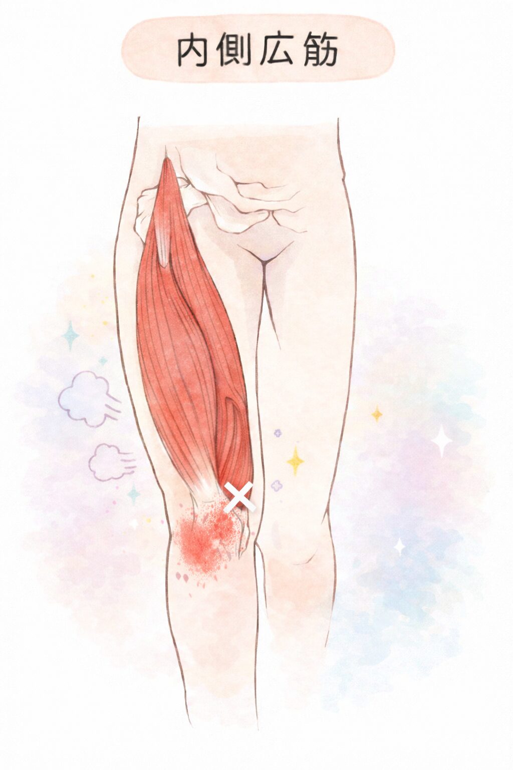 太ももの内側にある内側広筋(ないそくこうきん)が硬くなっていることがよくあります。
